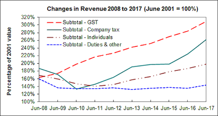 This graph has four lines showing the GST, company tax, individuals and duties and other revenue streams from June 2008 to June 2017.